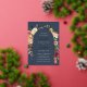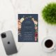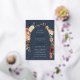 D'élégantes invitations à des mariages fleuris ou des mariages d'automne ou d'hiver présentent vos détails encadrés par une arche de roses d'aquarelle, de mamans et de verdure aux couleurs d'automne rustiques, y compris pêche, ivoire, rougissant, bordeaux et vert, avec des garnitures en feuille d'or et des scripts de calligraphie en or sur un arrière - plan bleu marine. Un design moderne et élégant pour des mariages rustiques chic en automne ou en hiver.