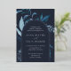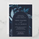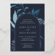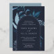 Notre faire-part de mariage Winter Azure entoure vos détails de jour de mariage avec une arche de feuillage aquarelle dynamique. Un choix moderne mais organique pour les mariages d'hiver ou de printemps avec des éléments botaniques peints de manière complexe. Colorway : Hiver azur, un mélange de bleus gelés sur un arrière - plan de la marine avec garniture en feuille d'argent.