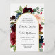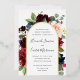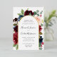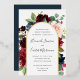 Notre faire-part de mariage Radiant Bloom entoure vos détails de mariage avec une arche de fleurs d'aquarelle peintes en marsala bordeaux, rose rousse et bleu marine, avec feuillage botanique vert et feuilles d'eucalyptus. Un beau choix de couleurs luxuriantes et saturées pour les mariages d'automne ou d'hiver, avec des garnitures luxueuses en feuille d'or.