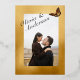 Élégant pourpre prune avec texte à feuilles d'or, cette invitation de mariage est complétée par des dahlias d'automne colorés, des roses, des anémones et des épis de blé pour créer une invitation saisissante. Le papillon monarque met en valeur le texte à feuilles d'or sur le devant et la photo du couple au dos pour un thème de mariage véritablement automnal.