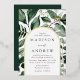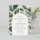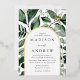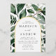 Invitations de mariage élégantes avec vos détails mariages nichés à l'intérieur d'un cadre en feuille d'or voûté entouré d'eucalyptus, fougères et autres riches verdure. Les invitations de mariage de l'arc botanique se retournent vers un arrière - plan vert foncé et solide. Conçu pour coordonner avec notre collection de mariages de verdure Abondante.