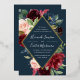 Notre faire-part de mariage Radiant Bloom entoure vos détails mariages d'un cadre géométrique de fleurs d'aquarelle peintes en marsala bordeaux, rose rousse et bleu marine, avec feuillage vert d'eucalyptus. Un choix moderne mais organique en vert et blanc avec des botaniques luxuriants et colorés et des lettres manuscrites, avec un luxueux garniture en feuille d'or.