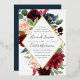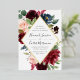 Notre faire-part de mariage Radiant Bloom entoure vos détails mariages d'un cadre géométrique de fleurs d'aquarelle peintes en marsala bordeaux, rose rousse et bleu marine, avec feuillage vert d'eucalyptus. Un choix moderne mais organique en vert et blanc avec des botaniques luxuriants et colorés et des lettres manuscrites, avec un luxueux garniture en feuille d'or.