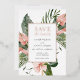 Foil pressé Mariage Enregistrer la Date pour une ambiance tropicale. Doté de fleurs tropicales roses et d'une végétation luxuriante. Inclure votre photo à l'arrière ou supprimer et laisser vide. Éditez avec votre libellé et choisissez parmi trois couleurs de feuille différentes, dont l'or, l'argent et l'or rose.