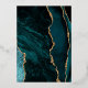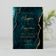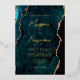 Cette élégante invitation de mariage présente une image arrière - plan d'agate bleue turquoise parée de parties scintillant en faux or. Le texte personnalisable combine écriture manuscrite moderne couleur or, cuivre et polices italiques. L'envers dispose d'un design d'agate turquoise et or coordonné.