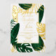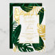 Mariage à feuille d'or tropicale aquarelle feuille verte avec feuille d'or véritable, un feuille exotique et tropical vert profond peint à la main, monstère, palmier et une bordure d'or luxueuse et chic avec un script de calligraphie moderne et élégant. Idéal pour les thèmes de destination et de mariage sur la plage.