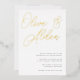 Une belle faire-part de mariage typographique avec vos noms dans un script de feuille d'or surdimensionné en haut. Personnalisez avec vos détails de mariage dans les lettres serif classiques alignées en bas à droite. Notre colorway de cendres fait une déclaration classique avec du papier d'aluminium noir et riche sur un arrière - plan blanc immaculé.