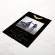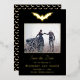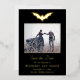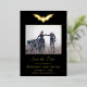 De superbes feuilles d'aluminium véritable et lettrage font que cette carte Enregistrer la date se démarque. Le fond est noir avec un motif de chauve-souris doré assorti. Parfait pour un mariage gothique ou d'Halloween.