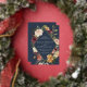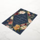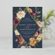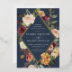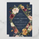 D'élégantes invitations à des mariages fleuris ou des mariages d'automne ou d'hiver présentent vos détails nichés dans un losange allongé entouré de roses d'aquarelle, de mamans et de verdure dans des couleurs d'automne rustiques, comme la pêche, l'ivoire, le rougissement, le bordeaux et le vert sur un riche arrière - plan bleu marine. La garniture en feuille d'or complète la conception.