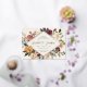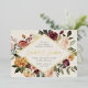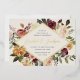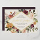 D'élégantes invitations à des mariages fleuris ou des mariages d'automne ou d'hiver présentent vos détails nichés dans un losange allongé entouré de roses d'aquarelle, de mamans et de verdure dans des couleurs d'automne rustiques, comme la pêche, l'ivoire, le rougissement, le bordeaux et le vert. La garniture en feuille d'or complète la conception.