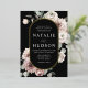 Élégantes invitations de mariage florales hivernales avec vos détails mariages affichés en lettres blanches nichées à l'intérieur d'un cadre floral ovale en feuille d'or avec un arrière - plan noir. Les fleurs d'hiver sont recouvertes d'une palette de couleurs de rose, rose clair, ivoire et jaune doré doux, avec des feuilles d'eucalyptus et des feuillages d'hiver dans des tons vert sauge et vert forêt riche.