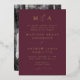 Faire-part de mariage minimaliste et moderne avec vos initiales monogrammes et les détails mariages affichés en papier doré avec accents de script de calligraphie. L'arrière - plan couleur vin peut être changé en une couleur de votre choix. Le faire-part de mariage de feuille s'inverse pour afficher votre photo de fiançailles vertical. Conçu pour coordonner avec notre collection de mariages Modern Elegance.