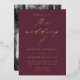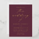 Faire-part de mariage minimaliste et moderne avec vos détails mariages avec "le mariage de" dans un élégant script de calligraphie de feuille d'or sur un arrière - plan de vin. L'invitation s'inverse pour afficher votre photo de fiançailles vertical à fond de sang. Conçu pour coordonner avec notre collection de mariages Modern Elegance.