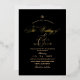 Faire-part de mariage royale moderne et design noir et or avec une police manuscrite élégante avec des boucles et un monogramme de la mariée et du marié. Invitation classique et élégante, simple et moderne.