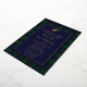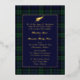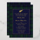 Classic Highland Black Watch tartan plaid et feuille de faire-part de mariage, avec une zone de texte bleu décoratif. Une façade de fougère de feuille orne le haut de la zone de texte. Personnalisez le texte pour votre mariage des hautes terres.