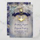 Les invitations à un mariage côtier ou en bord de mer sont accompagnées d'une ancre en feuille d'or, d'un monogramme bleu marine, d'une série de lumières et d'un arrière - plan rustique en bois flotté.