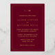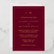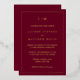 Faire-part de mariage simple avec un design moderne et élégant avec votre monogramme à deux lettres en haut et vos détails entourés d'une fine bordure. Ce dessin est imprimé avec de la feuille d'or réelle sur un arrière - plan bordeaux. Un design chic et design qui conviendra à un couple minimaliste.