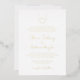 Faire-part de mariage en feuille d'or classique et classique avec une crête mariage avec votre monogramme à l'intérieur d'une couronne avec vos noms dans un script / calligraphie. Tous les éléments de conception sur le devant sont en véritable feuille d'or. Cette invitation simple mais élégante est idéale pour un mariage formel.
