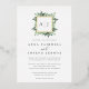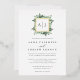 Notre faire-part de mariage en monogramme de serre présente vos initiales, monogramme ou duogramme en haut, niché dans une couronne carré de feuillage vert aquarelle, feuilles botaniques et de minuscules fleurs blanches sur un arrière - plan blanc croustillant avec garniture en feuille d'or. Un aperçu moderne de la tendance botanique pour les mariages d'hiver, les noces romantiques d'automne ou d'automne, ou les élégants mariages de soirée d'été.