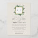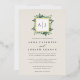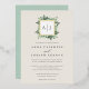 Notre faire-part de mariage en monogramme de serre présente vos initiales, monogramme ou duogramme en haut, niché dans une couronne carré de feuillage vert aquarelle, feuilles botaniques et de minuscules fleurs blanches sur un arrière - plan en ivoire crème doux avec garniture en feuille d'or. Un aperçu moderne de la tendance botanique pour les mariages d'hiver, les noces romantiques d'automne ou d'automne, ou les élégants mariages de soirée d'été.
