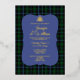 Clan écossais bleu et vert classique Murray plaid et feuille de faire-part de mariage, avec une zone de texte bleu décoratif. Un coeur de noeud celtique en feuille orne le haut de la zone de texte. Personnalisez le texte pour votre mariage des hautes terres.