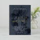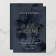 Élégant film sombre mariage invitation modèle avec botanique superposition d'oeuvre en bleu foncé, noms de couple pressé dans vrai feuille d'or. Les tons bleu foncé et noir donnent à cette papeterie mariage une sensation unique et sophistiquée. Il s'agit d'un modèle mariage entièrement personnalisable.
