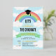 Invitation à une fête de remise de diplômes sur le thème de l'arc-en-ciel avec un arc-en-ciel portant une casquette de diplômé, des nuages et un ciel bleu avec des détails en feuille d'or.