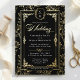 Elevate your stationery suite with this Regency-inspired wedding invitation. This design features a striking black background contrasted by an ornate gold foil floral border and a classic Victorian monogram crest. It is the perfect choice for couples hosting a formal black-tie affair or a vintage-themed celebration in a grand chapel.