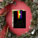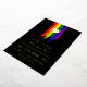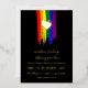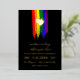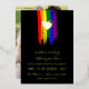 Charmante faire-part de mariage lgbt avec drapeau de la fierté arc-en-ciel dessiné avec des touches désordonnées et orné d'un coeur doré contre un arrière - plan noir avec texte en feuille d'or.