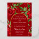 L'arrangement floral se trouve derrière les détails de la cérémonie mariage entourée d'une arche pour cette belle invitation aux fleurs rouges. La double arche est en papier d'aluminium (or, argent ou or rose). L'arrière de l'invitation est un petit arrangement floral au-dessus de la date du mariage en texte blanc sur un arrière - plan noir.