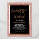 Ces invitations élégantes à des soirées bachelorette avec un faux look de parties scintillant or rose (veuillez noter que ce n'est pas une parties scintillant réelle, mais une image de parties scintillant) et le cadre du centre de feuille d'or rose, avec un modèle de feuille d'or rose moderne assorti écriture manuscrite. Le centre même de l'invitation est noir. Il y a de la place pour ajouter votre itinéraire à l'arrière.