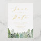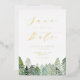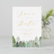 Cette carte de date personnalisable comporte une forêt à feuillage persistant enneigée et du texte brillant sur le devant. Vous aurez le choix entre de l'or, de l'or rose ou de l'argent pour une finition polie et attrayante. Son design d'inspiration nature en fait un lieu idéal pour les mariages d'hiver ou de campagne. Personnalisez-le avec vos noms et date mariage pour envoyer un faire-part élégant.