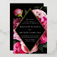 Élégante invitation à mariage floral avec vos détails mariages à l'intérieur d'un cadre diamant en feuille d'or avec un arrière - plan noir. Belle pivoine rose vif et rose vif avec des feuilles verts luxuriants. Les invitations de mariage en feuille d'or et en pivoine s'inversent à un arrière - plan noir avec de l'espace pour des textes et des images supplémentaires.
