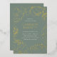 Parfaites pour les douches nuptiales de jardin de printemps ou d'été, ces élégantes invitations nuptiales de pivoine fleurie présentent une bordure de fleur de tourbe de feuille d'or illustrations, avec vos détails de l'événement en lettrage classique sur un arrière - plan vert de sauge poussiéreux. Personnalisez ces invitations classiques à la douche nuptiale avec le nom de la mariée, la date et l'heure de la douche, le lieu et l'adresse, le RSVP et les informations d'enregistrement.