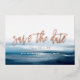 Cette annonce moderne mais élégante de sauvegarde de la date comprend une plage peinte / arrière - plan de l'océan, l'accueil "enregistrer la date" en papier d'aluminium pressé, et vos détails. Ce design serait parfait pour un mariage à la plage ou un mariage de destination. Vous pouvez customiser encore plus ce design en ajoutant une autre photo ou du texte supplémentaire à l'arrière-plan. Le pétrole est disponible en or, argent ou or rose et brille absolument ! Sélectionnez un vrai papier à feuille pour enregistrer les cartes de date pour ajouter ce facteur wow! !