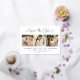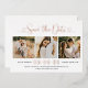 Maillot d'or rose moderne, mariage noir et blanc enregistrer la date faire-part cartes comprennent un collage de trois photos fiançailles carrés et un design de typographie élégant avec script de calligraphie chic et un accent cardiaque. Le texte personnalisé simple et élégant qui peut être entièrement personnalisé avec la date mariage numérique, les noms de mariée et de mariée, lieu de cérémonie, site du mariage, et l'invitation formelle à suivre le libellé.