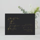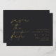 Mariage simple et élégant enregistrer les dates pour les couples minimalistes modernes fonctionnalité "enregistrer la date" en feuille d'or écriture manuscrite lettrage aligné à gauche. Vos détails de mariage apparaissent en lettres classiques à droite contre un riche arrière - plan noir de charbon de bois. Utilisez le dos pour partager des informations supplémentaires avec vos invités.