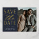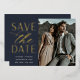 Une carte de datation moderne conçue pour accueillir votre photo fiançailles verticale préférée. "Enregistrer la date" apparaît à côté de votre photo dans un bloc de feuille d'or et des lettres de script, avec vos noms, date mariage et emplacement du mariage en dessous. Personnalisez le dos avec des détails supplémentaires, comme votre site Web mariage.