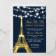 Un sweet sixteen moderne, chic et glamour avec une parties scintillant dorée dessinée à la main Tour Eiffel à thème Paris avec parties scintillant dorée scintille des confettis, des lampes à cordes blanches sur un arrière - plan bleu marine foncé et modifiable avec une véritable feuille d'or.