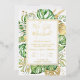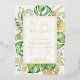Cette élégante invitation à la réception d'élégants salons tropicaux propose palmiers vert et or, philodendron et feuilles de fougères. Un cadre élégant en feuille d'or met en évidence le texte en feuille d'or. Les plaques en feuille d'or accentuent ce design botanique exotique et apportent un peu de fantaisie moderne à l'invitation. "Nous Nous Sommes Mariés ! " ainsi que les noms de la mariée et du marié sont présentés en haut. Les détails du vow mariage ainsi que l'emplacement et la date de la réception sont détaillés ci-dessous. Les informations RSVP sont au verso de l'invitation.