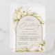 Baptême tropical chic ou invitations à baptême dans une palette de couleurs neutres attrayantes comprennent une arche en feuille d'or rose portant votre cérémonie d'église et les détails de la fête, accentuée de frondes de palmiers d'aquarelle vert pâle, feuillage de l'île de la plage, orchidées blanches, botaniques séchés aux saumons et gazon de la pampa.