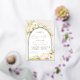 Les invitations de confirmation Tropical chic dans une palette de couleurs neutres séduisantes comprennent une arche en feuille d'or rose portant votre cérémonie d'église et les détails de la fête ou de la fête, accentuée avec des frondes de palmier vert pâle, le feuillage de l'île de la plage, orchidées blanches, botaniques séchés et gazon de la pampa.