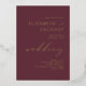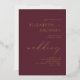 Cette faire-part de mariage moderne simple et élégante comprend le mot "mariage" dans un style élégant en feuille d'or. Personnalisez-le avec les noms de la mariée et du marié en lettres majuscules en feuille d'or serif (jointes par le mot "et" dans le script qui correspond à "mariage") et le texte restant en italique minuscule sur un arrière - plan bordeaux.