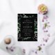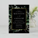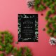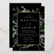 Invitations de mariage élégantes avec vos détails mariages nichés à l'intérieur d'un cadre rectangulaire en feuille d'or entouré d'eucalyptus, fougères et autres riches verdure avec un arrière - plan noir. Les invitations de mariage botanique modernes s'inversent à un arrière - plan noir solide. Conçu pour coordonner avec notre collection de mariages de verdure Abondante.