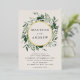 Invitations de mariage élégantes avec vos noms encerclés de feuille d'or avec des feuilles d'eucalyptus, frondes de fougères et autres riches verdure sur un arrière - plan crème. Personnalisez les invitations de mariage en feuille d'or en ajoutant les détails de votre mariage ci-dessous. Les invitations de mariage botaniques modernes s'inversent à un arrière - plan vert foncé. Conçu pour coordonner avec notre collection de mariages de verdure Abondante.