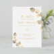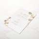Un arrière - plan blanc décoré d'eucalyptus dorés, sprigs. Personnalisez et votre nom et les détails de la cérémonie. Le texte est écrit avec de la feuille d'or réelle. Retour : arrière - plan d'or.