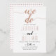 "We do" faire-part de mariage en véritable feuille d'or rose avec une police de script cursive magnifique dans le style d'écriture manuscrite. Le dos est recouvert d'un motif géométrique poussiéreux et blanc.