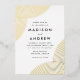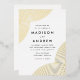 Invitations de mariage modernes avec des lignes géométriques tourbillonnantes en feuille aux coins avec un arrière - plan blanc. Personnalisez les invitations de mariage blanc et doré en ajoutant vos noms et détails mariages. Les invitations modernes de mariage de boho s'inversent pour afficher un arrière - plan blanc.