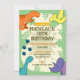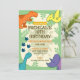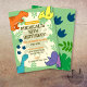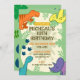 Dinosaures d'anniversaire de dinosaure mignonne avec des dinosaures jaunes, bleus, oranges et violets sur un arrière - plan de feuillage vert. Cette invitation est également un modèle que vous pouvez ajouter vos propres détails pour votre journée spéciale enfants. Disponible sous forme d'invitations imprimées ou de téléchargement numérique ou même les deux.