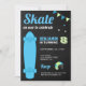 Éblouissez vos invités avec cette invitation de fête d'anniversaire à thème de skateboard cool avec un beau skateboard bleu avec typographie moderne contre un arrière - plan de tableau noir. Ajoutez simplement les détails de votre événement sur ce modèle facile à utiliser pour en faire une invitation unique. Retournez la carte pour révéler un élégant motif rayé au dos de la carte.